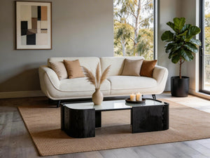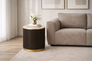 But the real showstoppers? The black ribbed side table and coffee table, finished with a signature gold trim band and smooth stone tops. That combination of dark fluted detail and warm brass is the kind of design move that elevates an entire room. They're bold enough to be features, refined enough to never overpower.