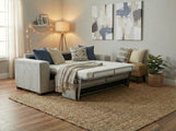 Upholstered in a soft, durable fabric with subtle vertical tufting along the arms and backrest, Uno brings a touch of modern sophistication to any living room, guest room, or study. The plush seat cushions ensure everyday comfort, while the sofa bed’s hidden base adds practical storage for bedding or cushions.